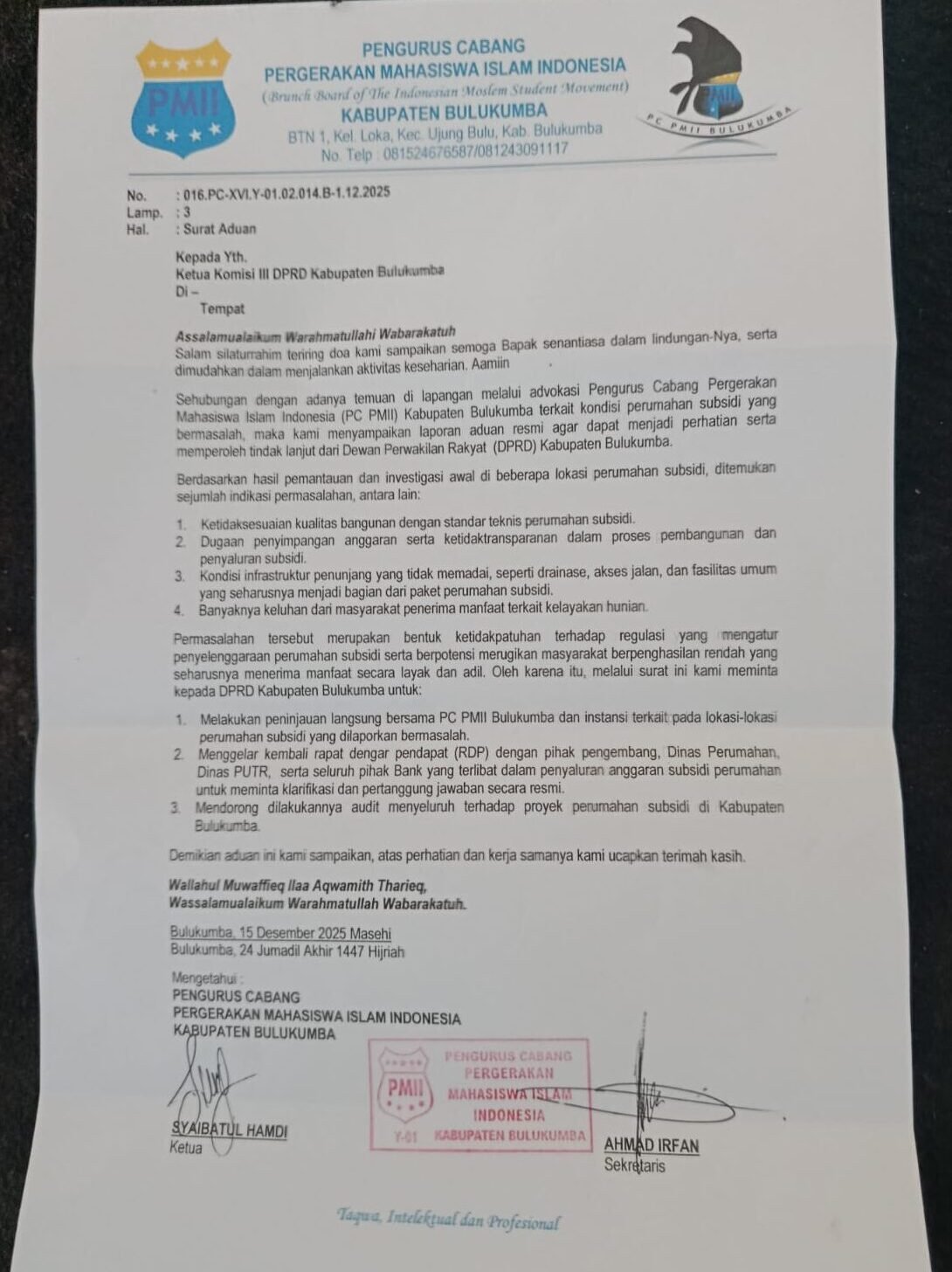 Bulukumba — Pengurus Cabang Pergerakan Mahasiswa Islam Indonesia (PC PMII) Kabupaten Bulukumba kembali melayangkan surat resmi kepada Dewan Perwakilan Rakyat Daerah (DPRD) Kabupaten Bulukumba terkait dugaan permasalahan pada program perumahan subsidi yang dinilai merugikan masyarakat, Senin (15/12/2025)